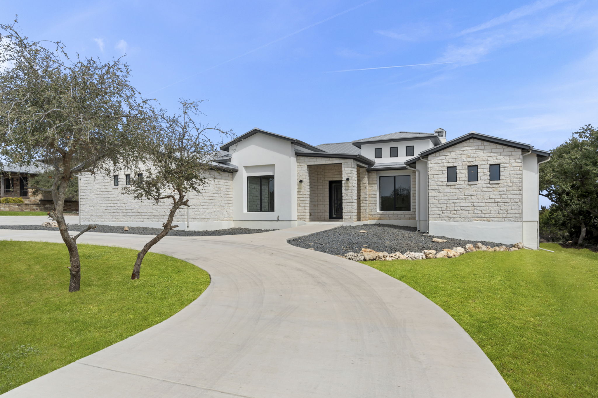 Experience refined Hill Country living in this exceptional single-story residence, nestled on a quiet street in the prestigious Vintage Oaks community, just off Hwy 46 near New Braunfels. Built in 2021, this meticulously crafted home showcases a striking stucco and stone exterior, brand new metal roof, and circular driveway, creating an immediate impression of sophistication. A custom metal and glass front door opens into an expansive open-concept living area, enhanced by high end flooring throughout, vaulted ceilings, floor to ceiling stone fireplace and an abundance of natural light. The gourmet kitchen serves as the centerpiece of the home, appointed with a six-burner gas cooktop, high end stainless steel appliances, built in refrigerator, oversized sink, and a spacious walk-in pantry with plenty of storage space and designated area for a secondary refrigerator. The living area transitions seamlessly to the outdoor entertainment patio with panoramic views of the Texas Hill Country, offering the perfect setting for gatherings or quiet evenings enjoying picturesque sunsets. The primary suite provides a private retreat featuring his and hers vanities, a Texas sized frameless glass rain shower with multiple rainhead shower heads and an expansive walk-in closet. A dedicated office located at the front of the home accommodates today's work from home needs with style and functionality.Four additional secondary bedrooms are situated on the opposite side of the primary providing additional privacy. The oversized three car garage is connected via a practical mudroom, ensuring everyday convenience. Sitting on just over an acre, this property offers ample space and privacy with no rear neighbor in sight. This extraordinary residence embodies the perfect balance of modern luxury and Hill Country charm crafted for those who seek excellence in both design and lifestyle. As part of the Vintage Oaks community, residents enjoy resort-style amenities including a fitness center, clubhouse, private sports courts, baseball field, lazy river, 3 community pools, miles of scenic walking trails, and a calendar filled with social activities. This extraordinary home offers refined Hill Country living at its finest.